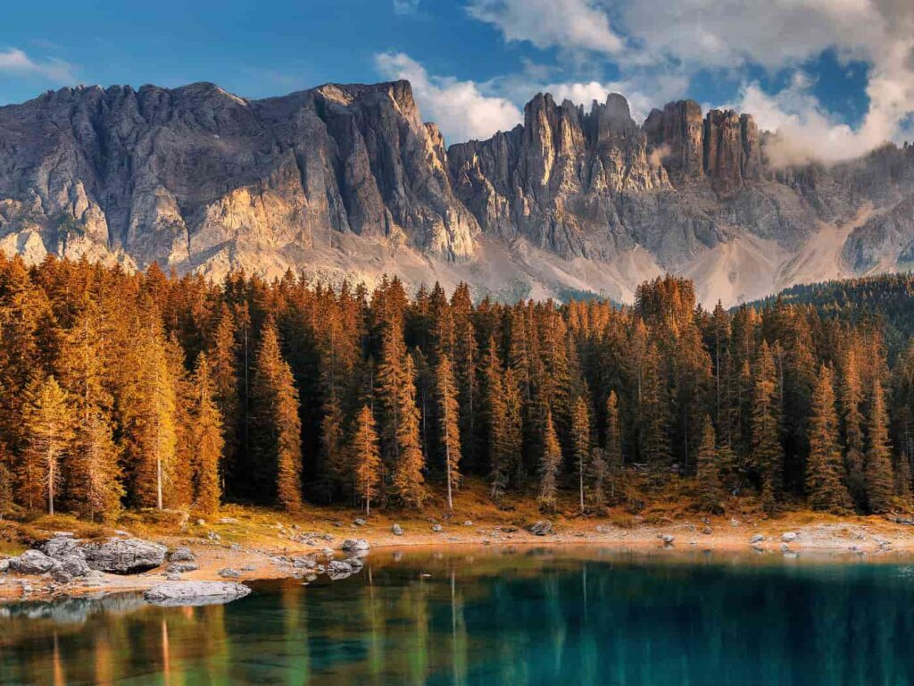 Il paesaggio autunnale del lago di Carezza, in Alto Adige