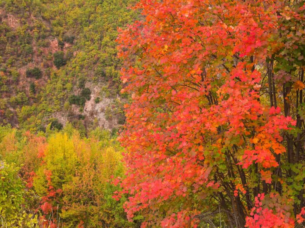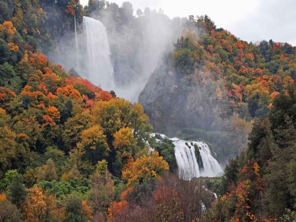 I faggi che tingono di rosso le montagne, le querce dorate delle colline, i castagni color rame e i pioppi che brillano come oro lungo i fiumi compongono un grande affresco. La Valnerina in autunno sembra una cartolina: i borghi medievali di Scheggino, Arrone e Ferentillo appaiono come isole di pietra immerse nei boschi. Poco distante, la Cascata delle Marmore mostra il suo volto più scenografico, incorniciata da ontani e frassini che assumono tonalità accese, in contrasto con la schiuma bianca dell’acqua. I sei sentieri che la circondano permettono di ammirarla da diverse prospettive, tutte immerse nei colori della stagione. Più in alto, verso Castelluccio di Norcia e il Pian Piccolo, le faggete diventano gallerie naturali dalle sfumature calde, ideali per chi cerca spazi aperti e silenziosi.