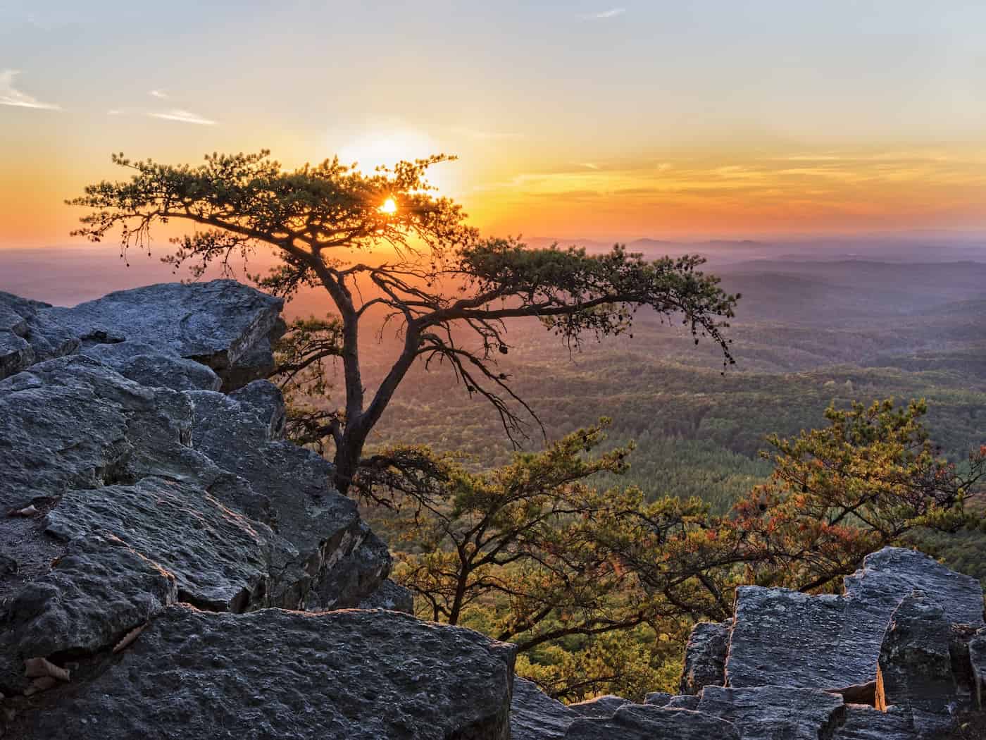 Per chi cerca un’escursione impegnativa e immersiva, il Pinhoti Trail rappresenta una delle esperienze più autentiche. Lungo 540 chilometri tra Alabama e Georgia (di cui 275 km solo in Alabama), questo percorso collega indirettamente l’Appalachian Trail e attraversa paesaggi spettacolari come le colline pedemontane degli Appalachi e la Talladega National Forest, che in autunno offre un’esplosione di colori. Il cammino parte da Flagg Mountain, nota per la sua torre panoramica, e si snoda tra creste rocciose, ruscelli, cascate e sentieri ripidi. È possibile campeggiare in autonomia secondo i principi del “leave no trace”, oppure utilizzare i rifugi forestali, le cabine storiche di Flagg Mountain o gli alloggi nei paesini limitrofi. Lungo il tragitto, non è raro avvistare il picchio dal ciuffo rosso, una specie rara e protetta.