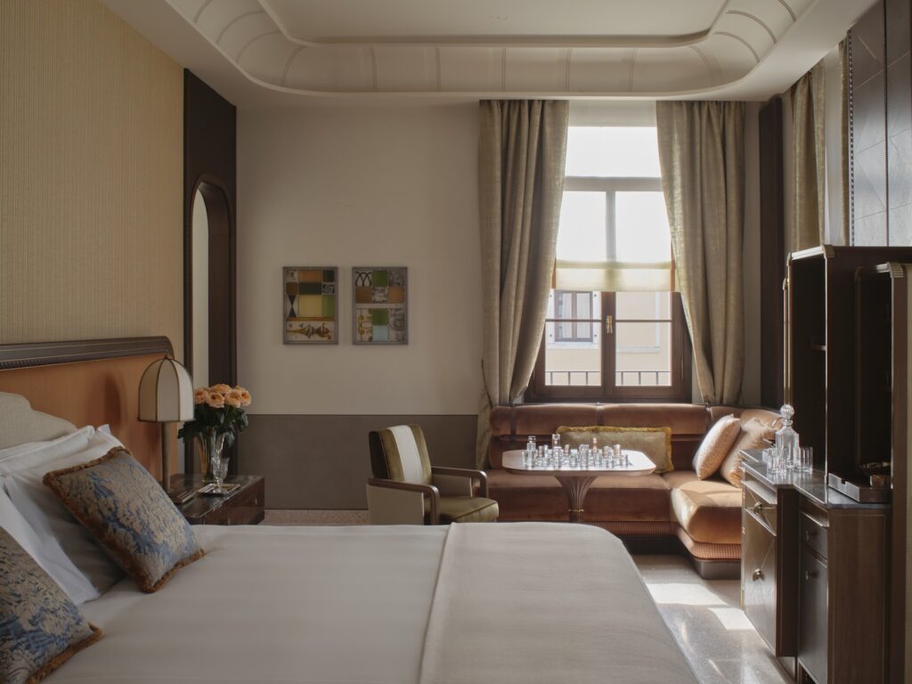 Orient Express Venezia ospita 47 tra camere, suite e residenze, ognuna progettata come uno spazio unico. Gli interni riflettono la stratificazione storica dell’edificio: soffitti decorati, affreschi restaurati, materiali preziosi e viste su canali o giardini contribuiscono a creare un’esperienza immersiva.