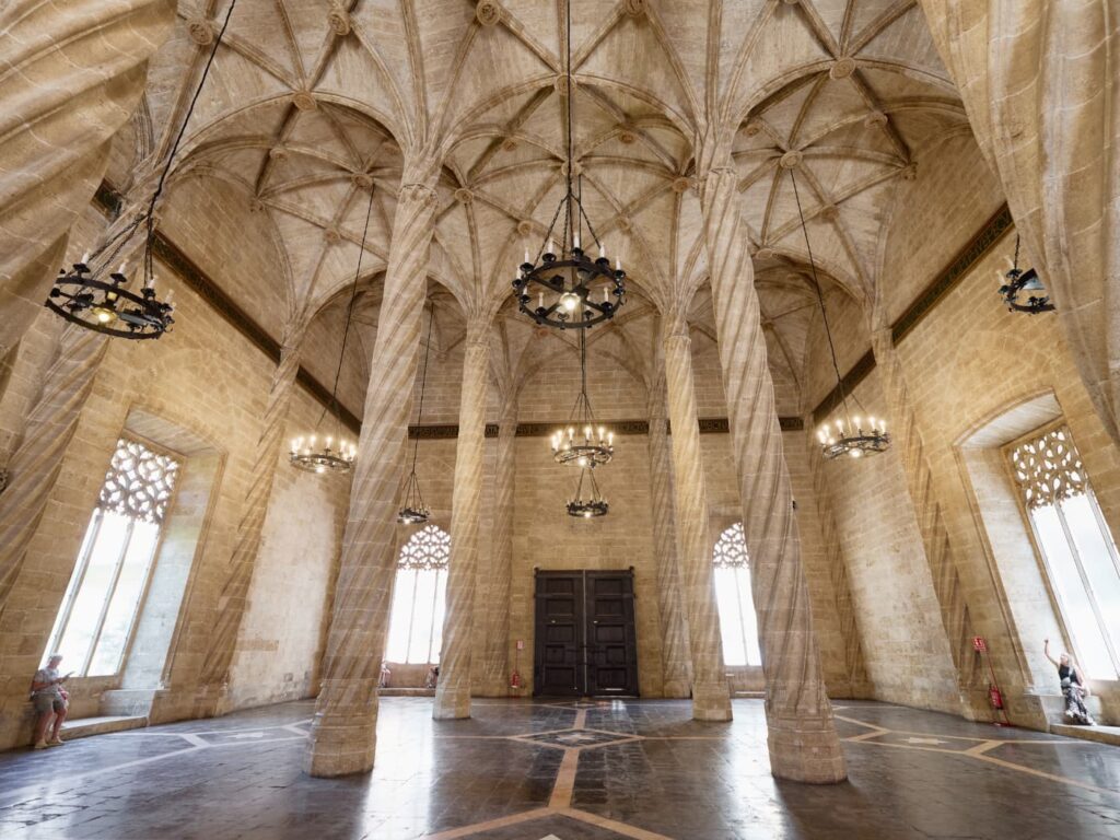 Ti viene in mente che sarebbe il luogo perfetto per un valzer di Capodanno o magari una milonga, ma in realtà la scritta su fondo blu che corre lungo le quattro pareti dell’enorme sala richiama all’etica dei mercanti e allude al rigore negli affari e nella vita che mal si addice alla danza. Profana resta, comunque, l’immagine di una Valencia che nel 1483 contava già 30mila abitanti, ricchi e potenti.