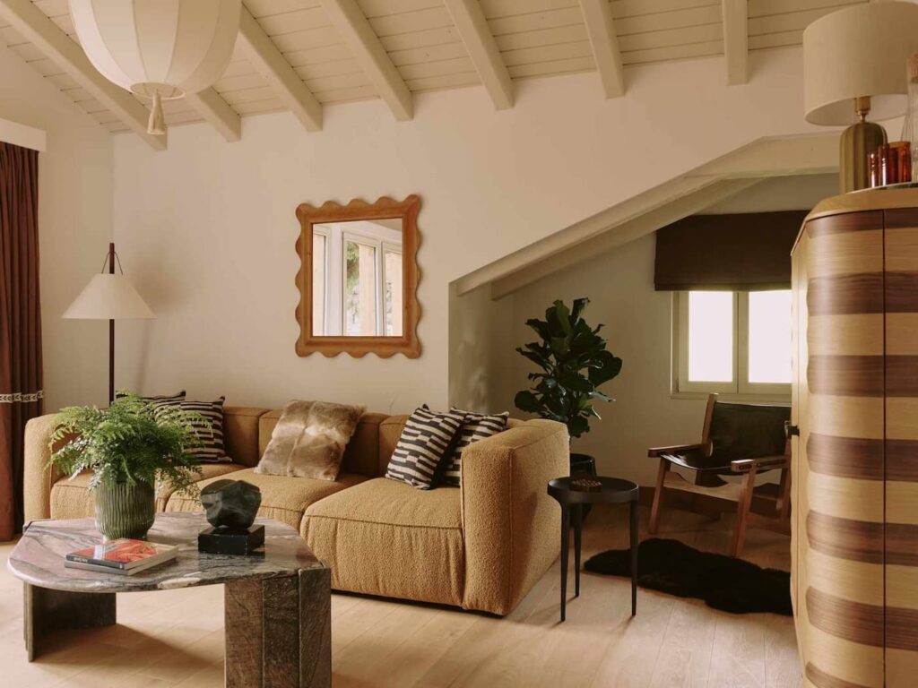 Le opere d’arte sparse ovunque, curate dalla Bisou Gallery di Amsterdam, erano una meraviglia per gli occhi, mentre il pavimento in ardesia naturale, con decorazioni a pattern irregolari, che ricopre il piano terra degli spazi comuni e l’area della piscina all’aperto, è stato posato da un artigiano che Maunder ha fatto venire dal Galles. E sua moglie artista, Andrea Anderson, ha creato nel suo studio ciascuno dei 950 piatti, ciotole e tazze in ceramica usati nell’hotel.