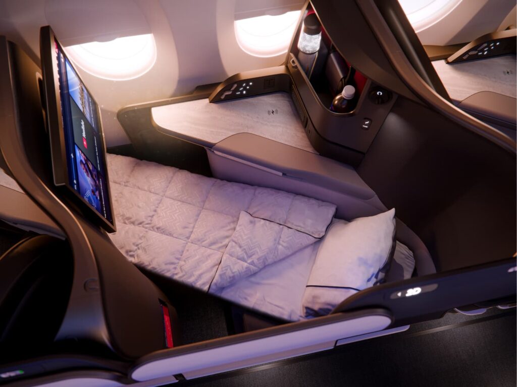 Le nuove cabine, sviluppate con Thompson Aero Seating, puntano su un’esperienza su misura. Il sedile si trasforma in un letto completamente reclinabile lungo oltre due metri, arricchito da materiali più morbidi e soluzioni intelligenti per l’organizzazione dello spazio, come vani dedicati a scarpe, dispositivi personali e accessori. La configurazione a spina di pesce inversa, con le poltrone orientate verso il finestrino, aumenta la sensazione di privacy, ulteriormente garantita dalle porte scorrevoli.