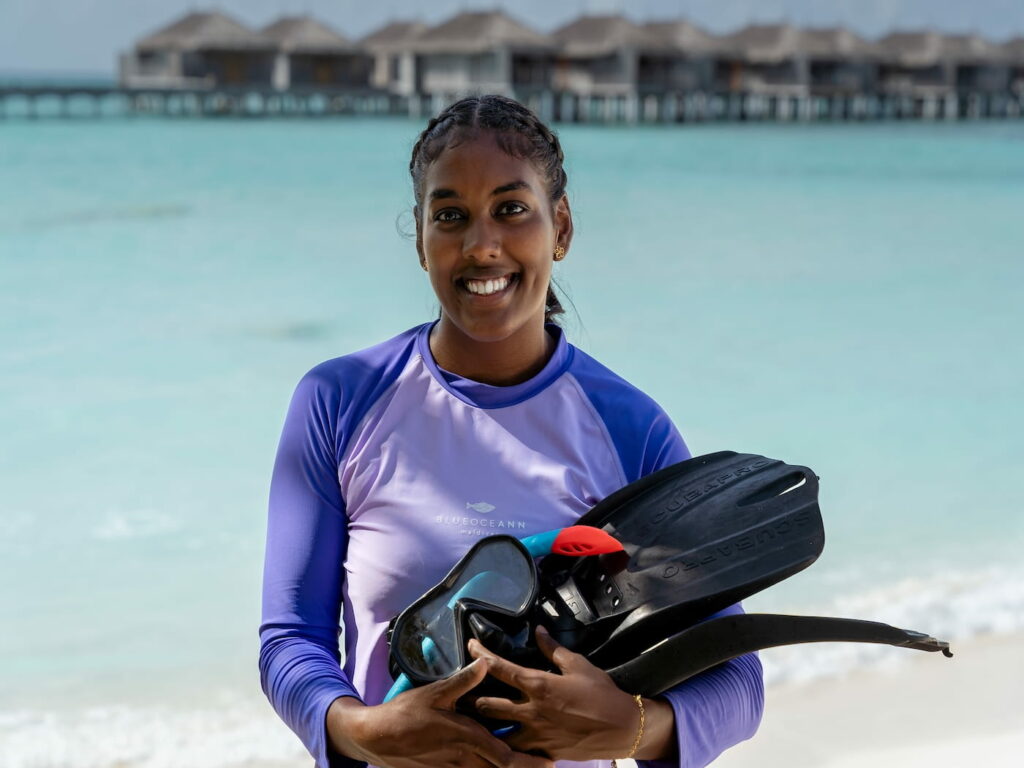 Il secondo è educativo: insieme a colleghi e volontari, Singainy partecipa a programmi nelle scuole degli atolli vicini, con l’obiettivo di creare consapevolezza sulla fragilità dell’ambiente marino. Tra i temi più delicati c’è quello delle tartarughe, oggi specie protetta ma per secoli una preziosa risorsa alimentare: “Sono abitudini difficili da modificare, su cui serve fare un lavoro paziente e rispettoso”. Del resto, un tempo questo consumo era sostenibile, ed è stato l’aumento della popolazione, insieme alla pressione sulle risorse marine, a cambiare le cose. Il terzo ambito è quello esperienziale, legato al rapporto con gli ospiti del resort: ogni settimana, Singainy tiene per loro un’introduzione informale all’ecosistema oceanico al bar principale della struttura. Non è una lezione accademica, ma un’introduzione accessibile.