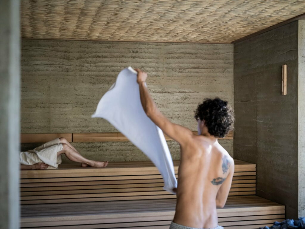 Ispirati a ciò che i finlandesi chiamano Gluthauch (letteralmente “soffio ardente”), gli Aufguss rappresentano il fiore all’occhiello dell’Adler Spa Resort Dolomiti, raffinato gioiello della Val Gardena che, immerso nel suggestivo paesaggio montano, invita a una pausa rigenerante nelle saune panoramiche affacciate sul lago. Cosa aspettarsi? Una performance decisamente scenografica e multisensoriale. Il maestro di sauna (Aufgussmeister), accompagnato da un piacevole sottofondo musicale, versa dell’acqua aromatizzata con oli essenziali sulle pietre calde, generando un vapore profumato che viene diffuso nell’ambiente tramite movimenti coreografici dell’asciugamano. Il calore del braciere libera le essenze naturali estratte da piante tipiche dell’ambiente alpino dell’Alto Adige — abete rosso, pino cembro, pino mugo e ginepro — apprezzate per le loro proprietà antisettiche, calmanti e balsamiche.
