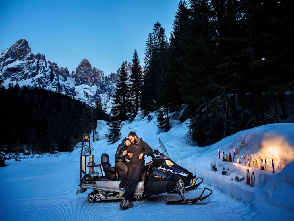 Le proposte per gli amanti della notte sono tante. Il mercoledì sera, per esempio, l’Alpe Tognola diventa il set perfetto per un aperitivo fuori dal comune. Si sale in motoslitta tra i boschi sopra San Martino di Castrozza e ci si ritrova davanti a un bancone di neve illuminato dalle fiaccole e dalla luna: con un bicchiere di vino rosso e i prodotti del territorio da assaggiare, si gusta la vista sulle Pale di San Martino. Ma c’è un’altra esperienza particolare da provare: una gita guidata sul gatto delle nevi che, ogni notte, prepara il manto delle piste per gli sciatori. Solcare le discese con questo imponente mezzo è un’av-ventura unica, che propongono sia sull’Alpe Tognola che sul comprensorio della Paganella. Ci si arrampica su salite ripidissime, affrontando discese al cardiopalma. Per chi vuole continuare la serata, alla Baita Colverde si cena assaporando birre artigianali e formaggi di Primiero con musica live.