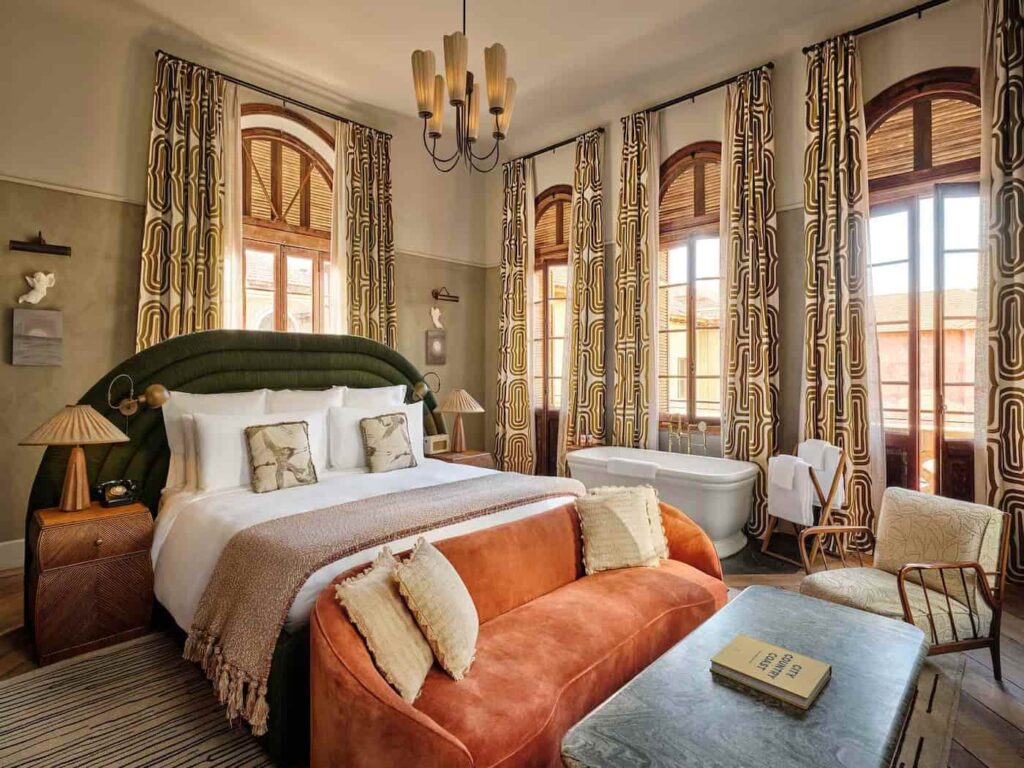 L’hotel offre 32 camere di dimensioni variabili da 19 a 95 metri quadrati. Le più grandi includono vasca da bagno, zona soggiorno e terrazza privata. Pavimenti con motivi geometrici, ampi armadi in legno e divani in velluto color gioiello conferiscono alle camere un tocco di calore. Tende a fantasia, piastrelle dipinte a mano nei bagni e articoli da toeletta al profumo di agrumi provengono tutti da artigiani locali. Il mio elemento preferito in camera era la vasca da bagno freestanding nascosta accanto al letto. Ci entravo con entusiasmo ogni sera dopo una lunga giornata di esplorazione.