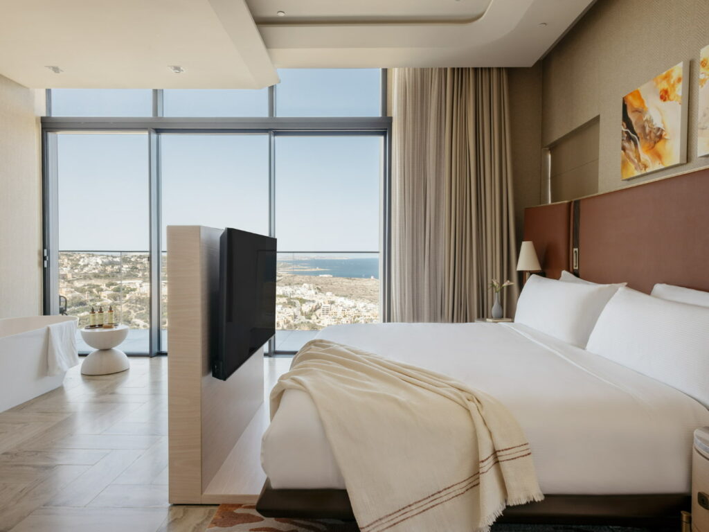 Il progetto dello studio di Zaha Hadid è ambizioso. Due torri, svettanti e futuristiche, puntano al cielo, legate nello stile fluido, le linee curve, le facciate a vetri, ma separate nell’animo: un grattacielo ospita appartamenti e residenze, l’altro è il nostro hotel, il nuovo ME Malta. A legarle, oltre alla firma dell’architetto, anche lo spazio esterno, un villaggio animato di bar, negozi e ristoranti affacciati sulla grande piazza, cuore del quartiere. Le Mercury Towers sono uno degli ultimi progetti di Hadid, e incarnano il suo approccio innovativo al design, funzionale e avvolgente. L’iconico “twist” sfida le convenzioni ingegneristiche: sembra che la struttura si giri per guardare il mare, avvolgendosi su sé stessa. Se di giorno le grandi vetrate riflettono la luce del sole inondando gli spazi interni di luce naturale, la sera giochi di luce animano la facciata, colorando lo skyline.