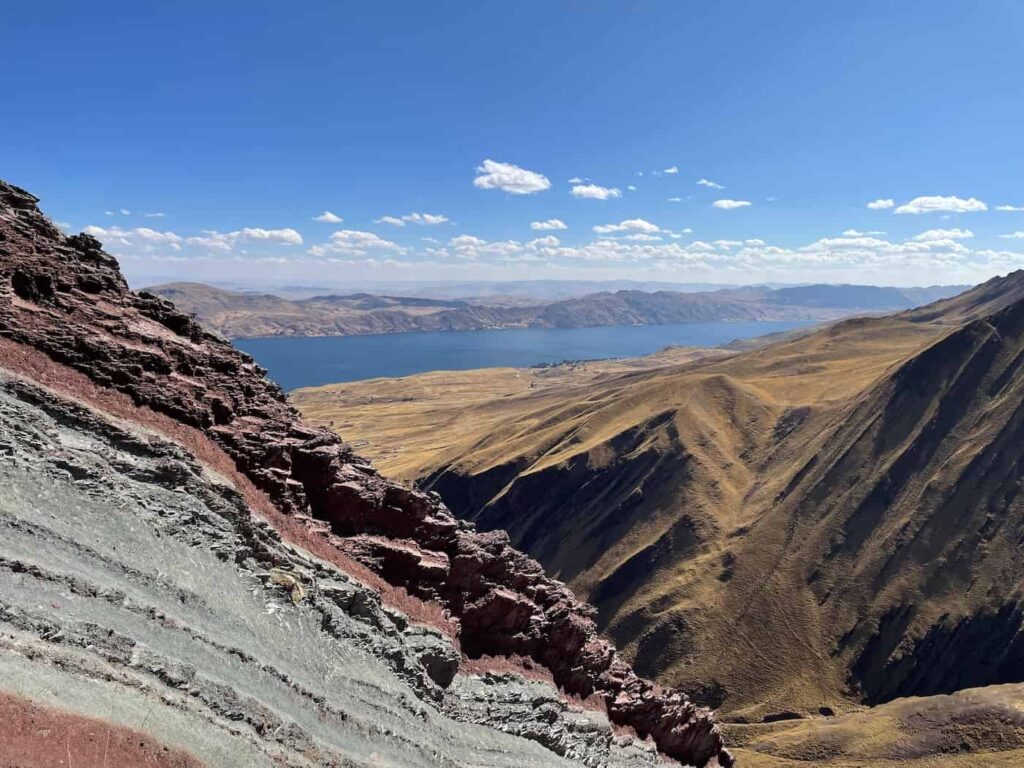 Il percorso porta anche alla Laguna Langui Layo, a quasi 4.000 metri di altitudine. Qui, le acque limpide riflettono i colori mutevoli del cielo, creando un contrasto affascinante con le terre arcobaleno di Pallay Punchu. Insieme, montagna e laguna compongono un potente dialogo tra terra e acqua, due elementi cardine della spiritualità andina.