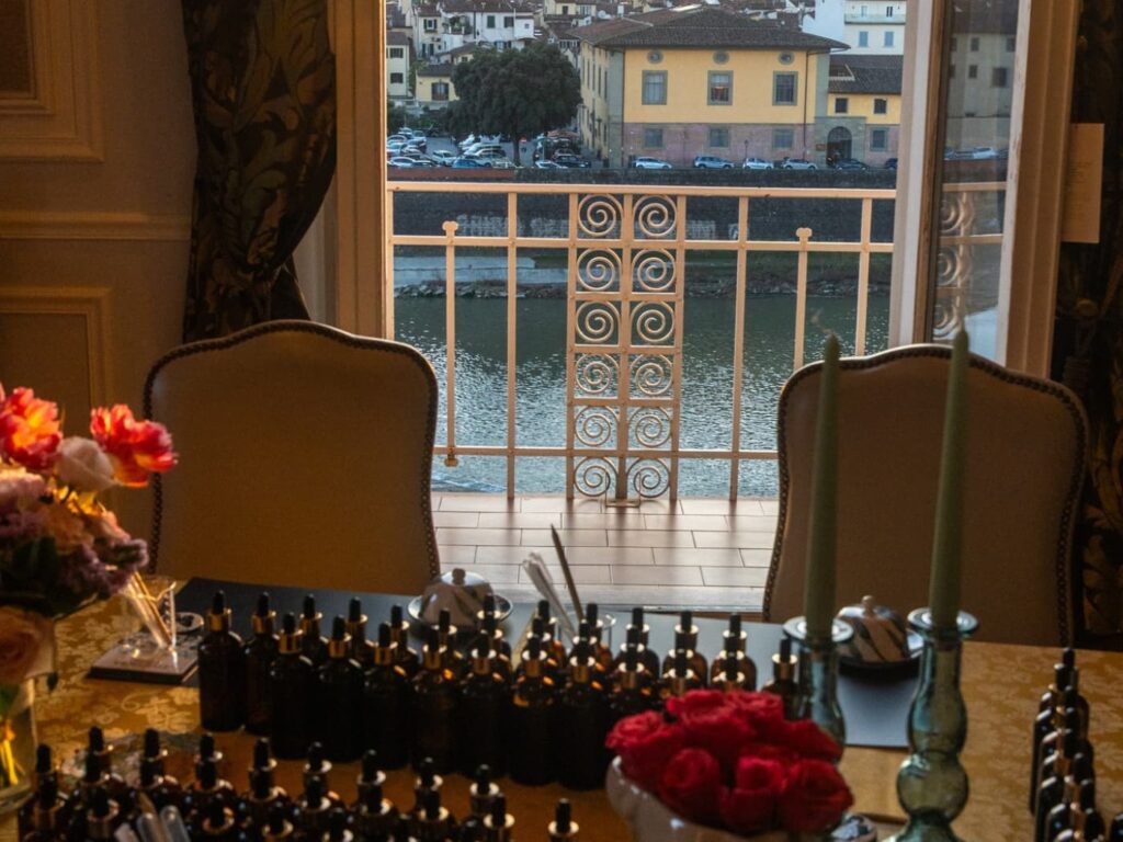 Il tutto affacciato su una delle viste più suggestive della città: Ponte Vecchio. «È come essere su un tappeto magico, ci saliamo sopra e creiamo uno spazio tutto per voi», ci accoglie Manuela Ricci Bocciolini, accompagnandoci in un percorso intimo e personale verso la scelta della nostra fragranza, dove il profumo non è una decorazione ma una dichiarazione di chi siamo. La mia scelta ne è stata la conferma: il sale, memoria delle mie origini di mare; l’oud, definito l’“oro nero” della profumeria artigianale; e infine il giglio, forse scelto in omaggio alla bellezza di Firenze.