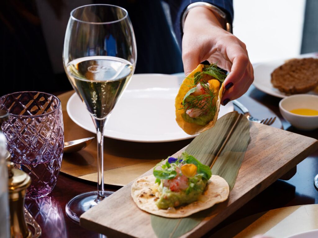 Tra un ultimo sorso e qualche chips al tartufo e al peperone, il cocktail lascia spazio alla cena e l’appuntamento si sposta al Caffè dell’Oro, il ristorante del Portrait Firenze. Il locale accoglie in un’atmosfera elegante ma informale, fatta di materiali caldi, arredi su misura e una luce soffusa che invita all’intimità, con fotografie in bianco e nero alle pareti che richiamano gli anni Cinquanta e dettagli come le tovagliette in ottone, il cui disegno suggerisce i confini di Ponte Vecchio e del fiume Arno.