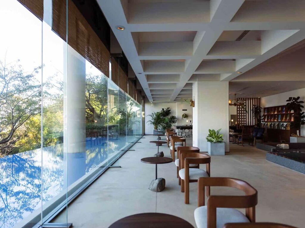Sfruttando la sua posizione privilegiata, la luminosa e ariosa hall dell’hotel vanta finestre panoramiche con vista sul mare. Il piano terra ospita ora un nuovo bar con una parete ricoperta di dischi in vinile e una lounge arredata con videogiochi retrò e poster d’epoca. Gran parte dell’arredamento richiama il passato dell’hotel, in linea con il suo autoproclamato concetto di “lusso nostalgico”, dai lampadari originali ai posacenere in ceramica che hanno trovato nuova vita come lampade a sospensione. Le camere e le suite sono straordinariamente spaziose, con la più piccola che raggiunge ben 86 metri quadrati.