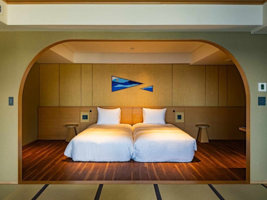 Ogni sistemazione dispone di un balcone privato con vasca idromassaggio all’aperto alimentata da sorgenti termali, con vista sull’oceano e sulla spiaggia di sabbia nera di Atagawa. Per completare il tutto, il minibar è gratuito, così come il servizio in camera pomeridiano e serale con un menù di snack e spuntini leggeri. Mentre la sala da ping pong dell’ex ryokan continua a essere aperta a tutti gli ospiti, la sala karaoke è stata trasformata in una particolare suite a tema karaoke con palla da discoteca e sauna. Le più spettacolari, tuttavia, sono due suite che un tempo fungevano da bagni pubblici della locanda.