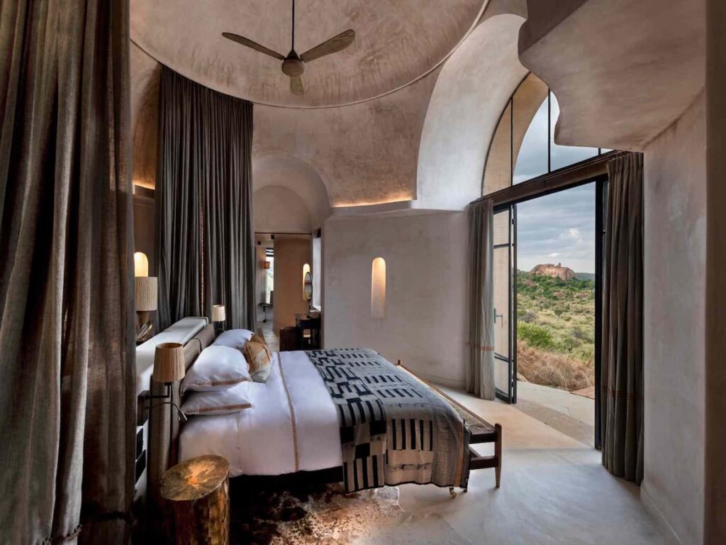 Le 14 suite del lodge, tra cui una familiare con due camere da letto, si estendono in entrambe le direzioni dalla zona centrale principale. Il design — firmato dagli studi Nicholas Plewman Architects, con sede in Sudafrica, e Michaelis Boyd, insieme agli interior designer di Fox Browne Creative — si ispira ai kopjes, le formazioni rocciose circostanti. Le curve scultoree del lodge, i materiali organici e i tetti coperti di erba mirano a fondere le strutture con l’habitat circostante e le piante autoctone.