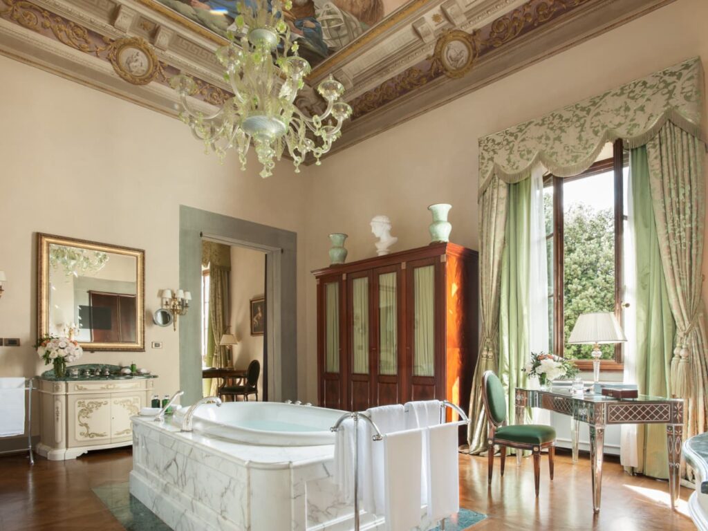 Avvolto da uno dei giardini privati più suggestivi della città e ospitato in due edifici rinascimentali – il Palazzo della Gherardesca e il Palazzo del Nero – questo iconico resort urbano di lusso è un concentrato di storia, bellezza e raffinatezza. Le suite, impreziosite da affreschi e dettagli architettonici originali, offrono non solo comfort, ma anche un affaccio privilegiato sull’eredità rinascimentale. Le sale da bagno, capolavori di design e artigianalità, si distinguono per materiali pregiati e finiture ricercate, trasformandosi in rifugi sensoriali. In alcune suite, la vasca in marmo al centro della stanza, diventa un’oasi di benessere, da cui ammirare il giardino o perdersi nella poesia delle decorazioni pittoriche, semplicemente alzando lo sguardo.