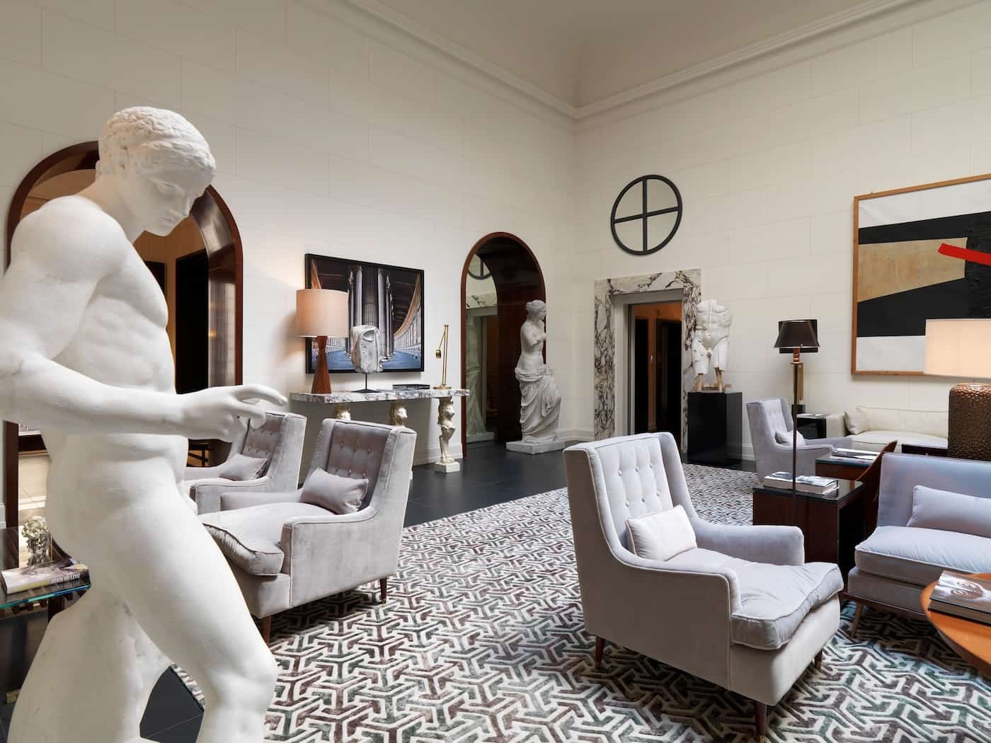 La posizione del J.K. Place Roma è riservata, quasi nascosta, come se l’edificio volesse proteggersi dal passaggio delle folle. All’interno, Michele Bönan, interior designer fiorentino, ha tradotto la dolce vita romana degli anni ’50 e ’60 in una grammatica contemporanea che sintetizza i molteplici volti della città eterna. L’architettura dialoga con la classicità e con il razionalismo, mescolando riferimenti storici e tensioni moderniste. La hall centrale, pensata come un soggiorno, rimanda alla Roma antica e al primo Rinascimento, con una pulizia formale che si esprime attraverso simmetrie e proporzioni rigorose. Statue classiche, un camino del XVII secolo, lampade a sospensione di Estro, sedie in tessuto beige Dedar e opere d’arte moderna folgorano lo sguardo, divertendo e perturbando chi osserva. Proprio come l’iconica pellicola di Fellini.