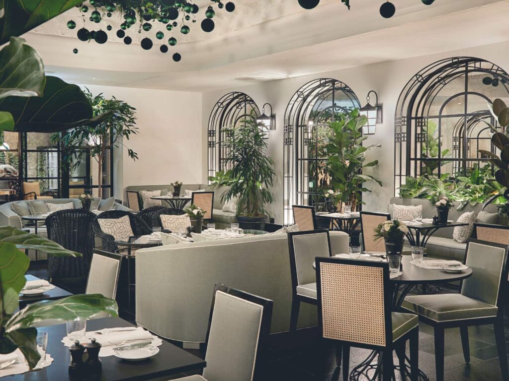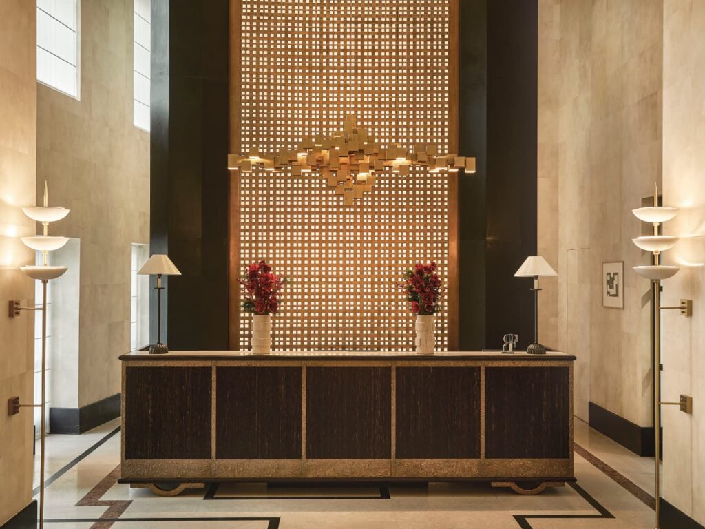 Varcata la soglia, è proprio l’interior design a catturare l’attenzione. Gli spazi sono stati progettati da Paolo Moschino e Philip Vergeylen, con la supervisione di Olga Polizzi, vicepresidente e direttrice del design del gruppo: raccontano un equilibrio tra ricchezza tattile, dettagli artigianali e contaminazioni artistiche. Mentre la corte interna, illuminata dalla grande cupola di vetro, diventa il cuore pulsante dell’hotel, gli ambienti comuni accolgono opere d’arte, pezzi di antiquariato e di design, provenienti da tutto il mondo. Come il tavolo di Ado Chale, protagonista della lobby, o le sculture di un leone e di una leonessa – risalenti al 1840 circa e attribuite a Thomas Milne RA – donate al The Carlton dalla Famiglia Forte e poste ad accogliere gli ospiti all’ingresso.