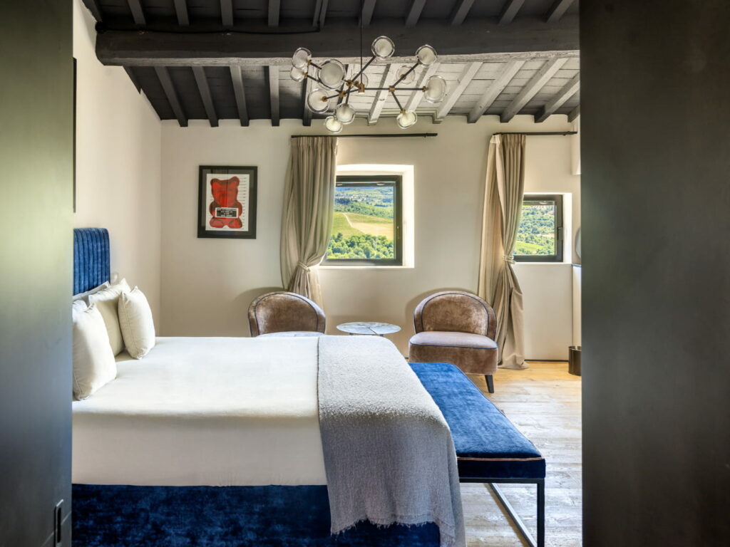 Le camere, frutto di collaborazioni con brand come Antonio Lupi e Alessandro Bini, sono ampie ed eleganti, dotate di riscaldamento e raffreddamento a pavimento per un comfort discreto. Accanto, sorge La Villa, una torre medievale trasformata in uno spazio esclusivo per eventi e soggiorni di gruppo. Per un momento di benessere, c’è la wellness area con sauna, bagno turco, doccia sensoriale, idromassaggio e aree relax, avvolte dai profumi firmati Dr Vranjes. Per rilassarsi davanti alla vallata, basta accomodarsi sui lettini di design della pool garden dove al mattino, sul prato adiacente, si organizzano anche sessioni di yoga. Non manca nemmeno la gym area, con ampie vetrate affacciate sul giardino all’italiana e sulla vallata.