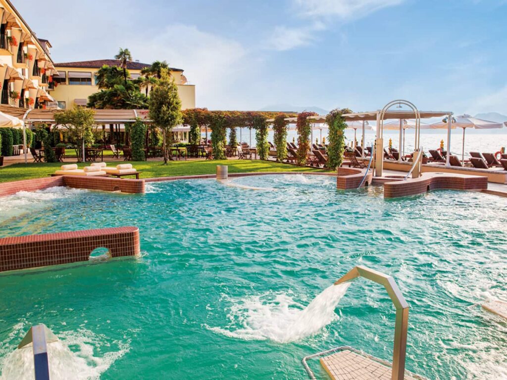 Sulla sponda lombarda del Lago di Garda, un hotel pieds dans l’eau, nel senso che è letteralmente affacciato sulle acque azzurro chiaro del lago, oltre che distante solo pochi passi dal Castello Scaligero che attira turisti da tutto il mondo. Si tratta di un raffinato albergo a vocazione termale, con il vantaggio di una medical spa interna e di una piscina outdoor colma di acqua sulfurea salsobromoiodica, nella quale si consiglia di sostare per 20 minuti circa, facendo il pieno di benefici, in particolare per pelle e articolazioni.